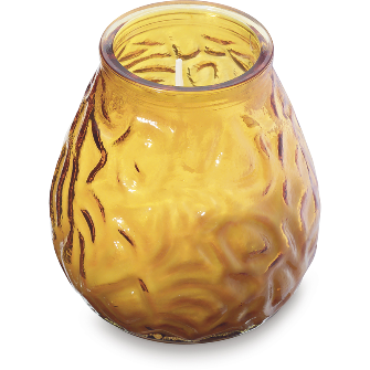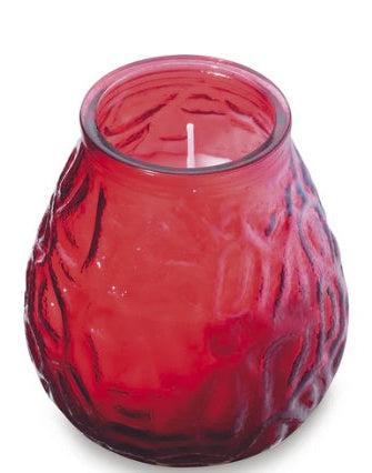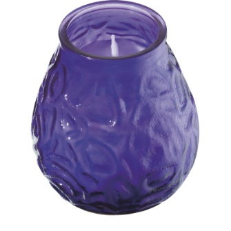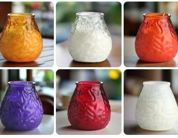 Filled candle in a coloured glass jar available in Clear, White, Amber, Orange, Red, Purple & Lime.